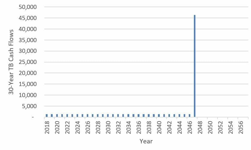 Chart 2: Cash flows from a traditional, nominal 20-year TB (with a 3% annual coupon)