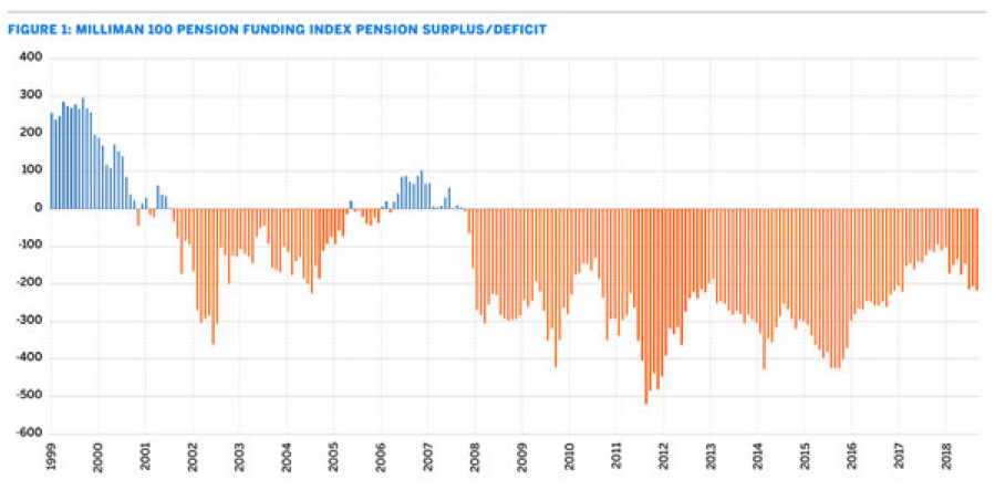 The accompanying surplus/deficit chart tells the story. It shows the history of the Milliman 100 Monthly Pension Funding Index (PFI), which measures the aggregate funded status of the 100 largest U.S. corporate DB pension plans.