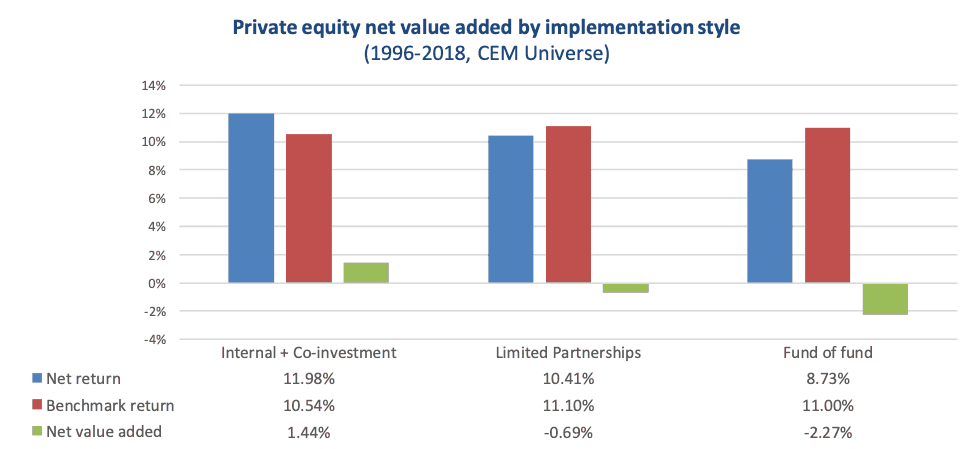 Analysis of institutional investor private equity allocations shows the differences in implementation styles and related costs are a key driver of a wide dispersion in private equity results. Researchers at CEM Benchmarking recommend smaller investors should consider investing in small cap equity rather than PE, and larger investors should consider internal or co-investment options. Regardless, costs matter, a lot, in PE.