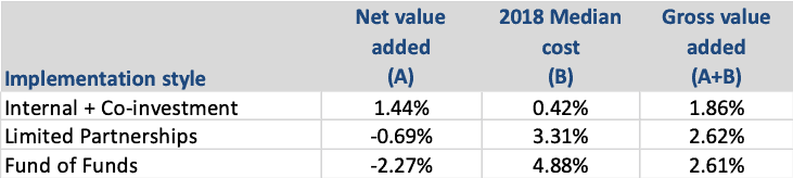 What stands out is that all implementation styles did much better than the small cap benchmark before considering costs. In fact, the highest cost fund of funds style outperformed the lowest cost combination of internal plus co-investment by 75 basis points gross of costs.