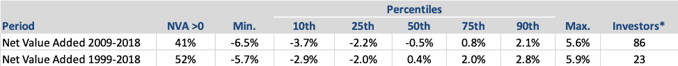 *Includes only investors with consecutive private equity data for each time period. Net value added shown versus the lagged small cap benchmark.