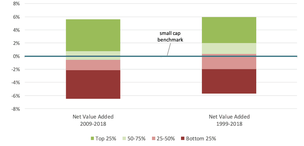 *Includes only investors with consecutive private equity data for each time period. Net value added shown versus the lagged small cap benchmark.