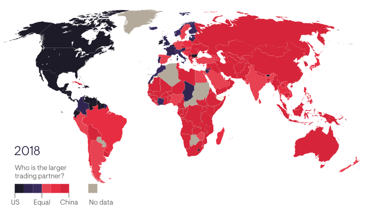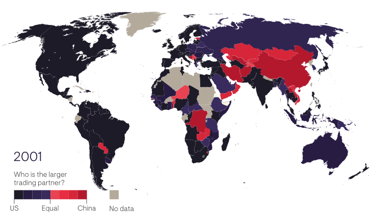 How much China has changed the global trade map is best illustrated in the ‘before’ and ‘after’ maps below. The start date is 2001, when China entered the WTO. The world was largely blue, with the US dominating bilateral trade patterns. By 2018 it was mostly red, as China had supplanted the US.