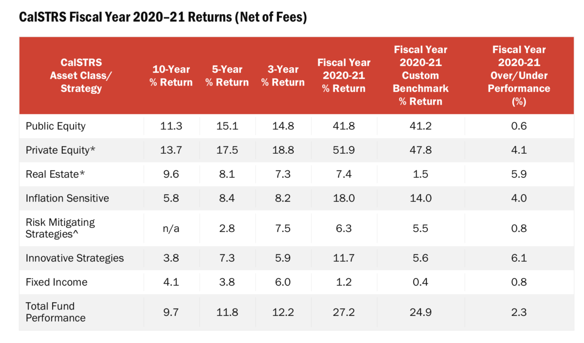The $308.6 billion CalSTRS has outperformed its custom benchmark in every asset class to deliver a historic fund performance of 27.2 per cent for the year against a return assumption of 7 per cent.
