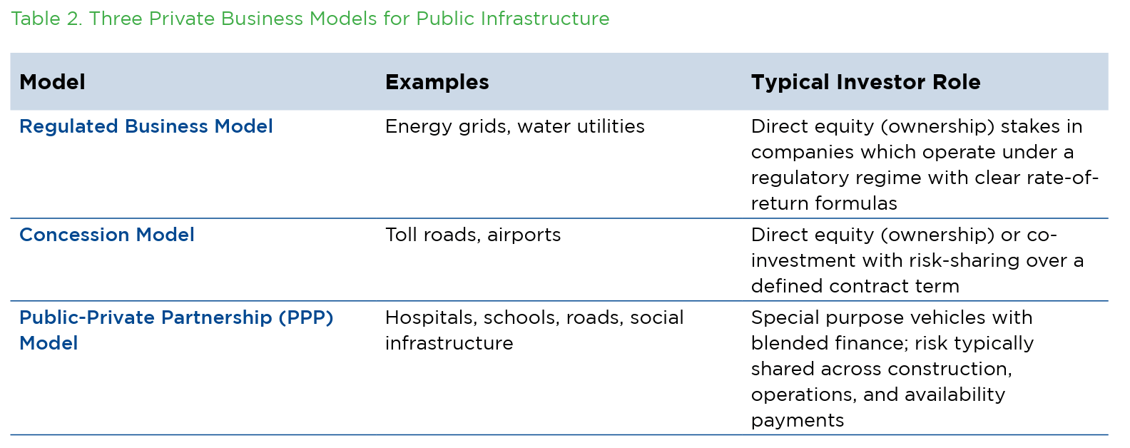 For example, investors can own the assets indefinitely in the regulatory business model but only for a pre-defined period in the concession model. The government retains asset ownership in the PPP model while allowing private investors to develop or operate the asset, leading to a higher degree of control.